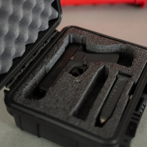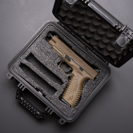 This 11" Single Pistol Case #184 has pre-cut foam to hold 1 pistol and 2 magazines. The pistol form includes plugs to accommodate various barrel lengths and flush mount tactical lights. These forms measure 5”, 6.5”, and 8.5”. The #184 Case includes the convoluted (egg-crate) foam in the lid.