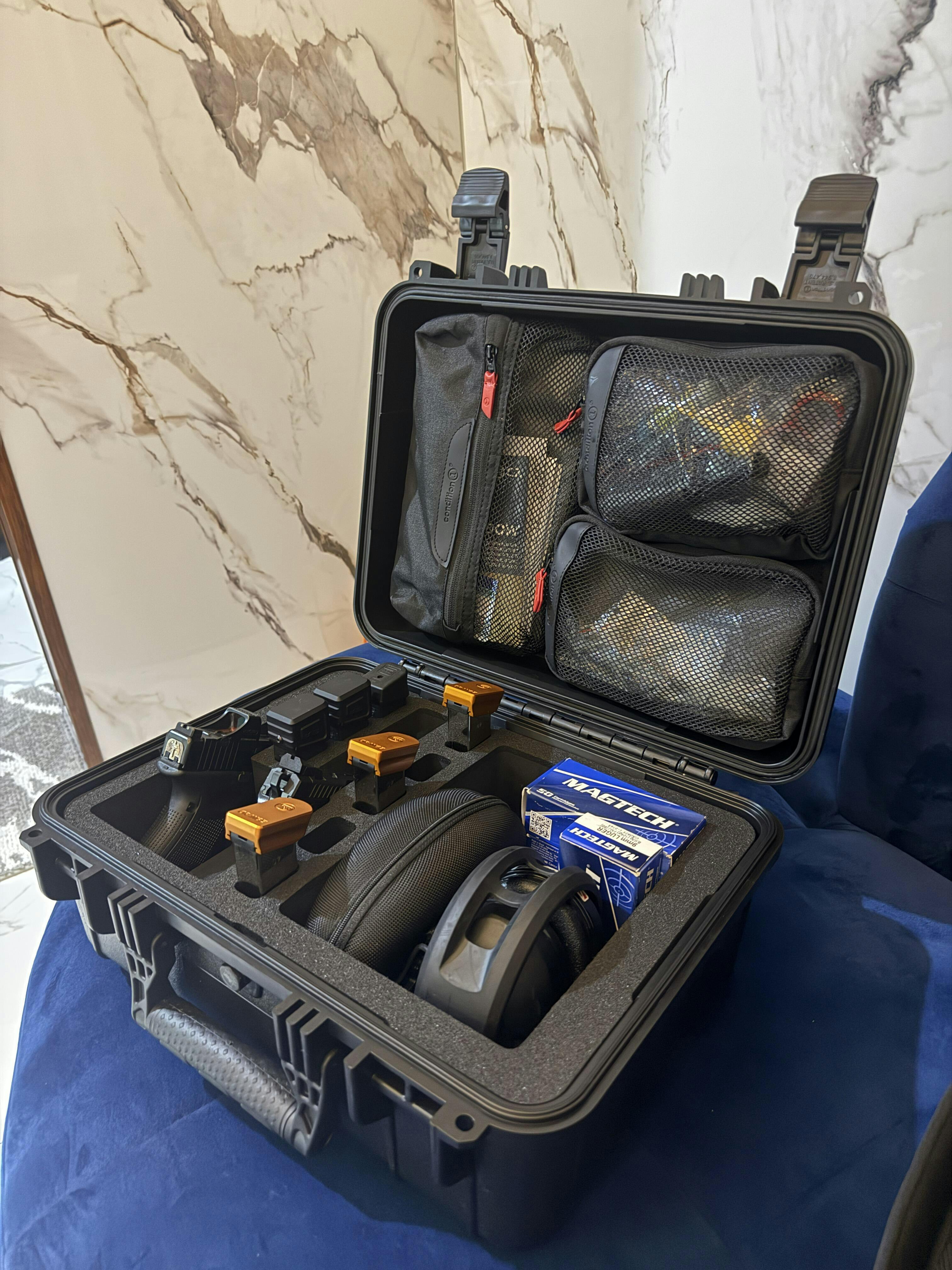 This 16" Case #179 has pre-cut foam for 2 pistols, 8 magazines and has a large dump pocket for accessories and range gear.