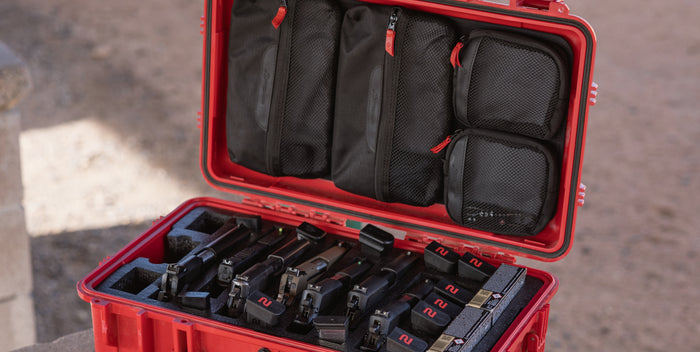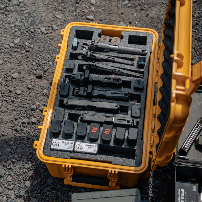 This 22" Case #300 has pre-cut foam for 7 pistols, 14 magazines, ammo boxes, and accessories. Pistol forms are 8.50” length x 1.25” width x 4” deep. Magazine forms are 0.875" x 1.25" and 4" deep. Accessory pocket is 9.75” length x 1.35” width x 2.50" deep. Plus two bonus accessory pockets. Includes convoluted (egg-crate) foam in the lid.