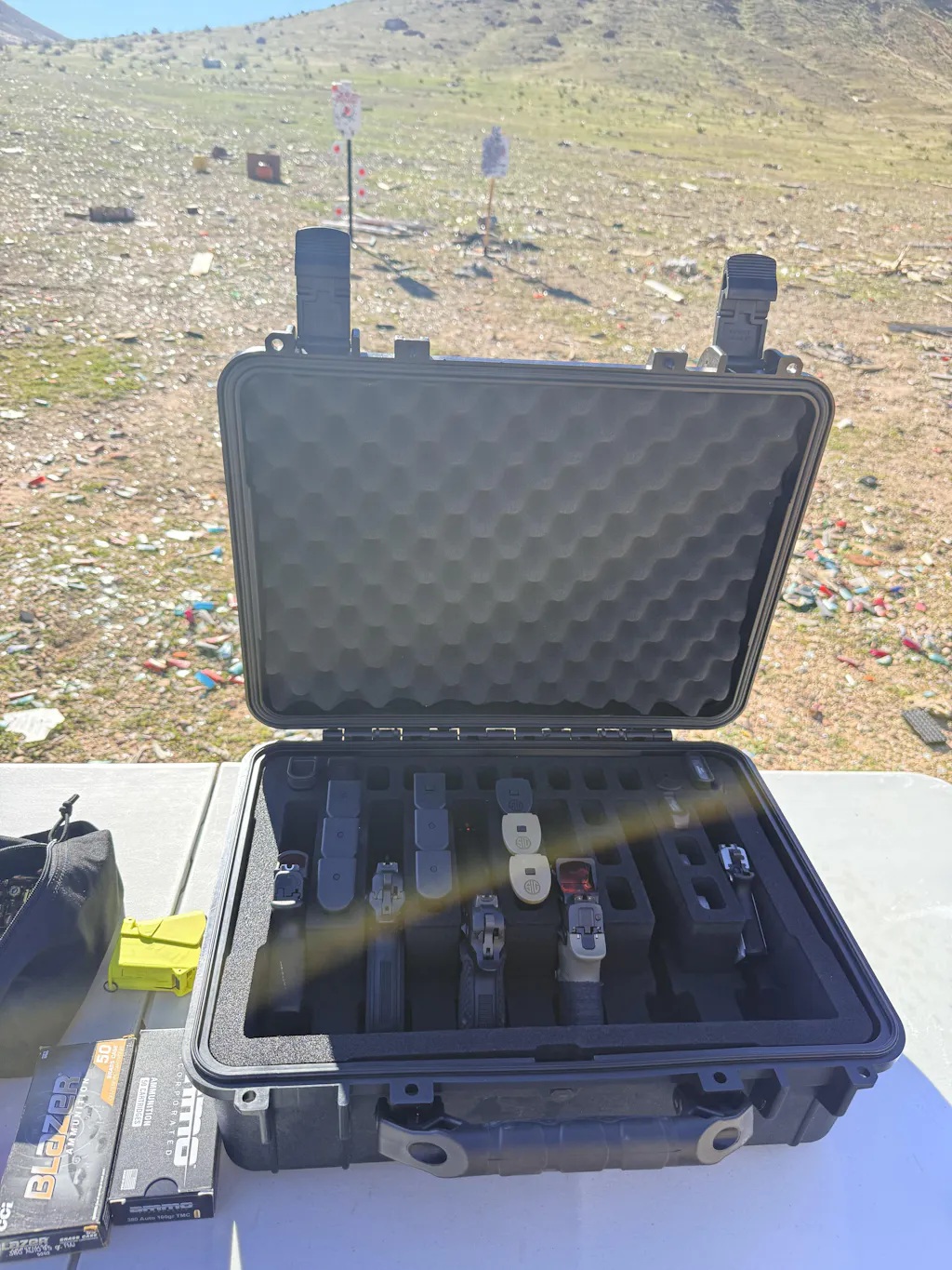 Pre-cut foam is assembled to hold 6 firearms, 27 magazines, and accessories.