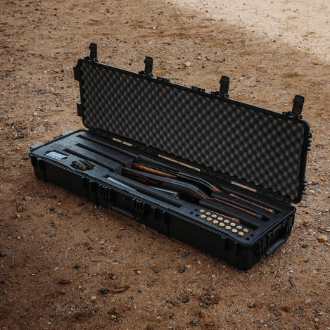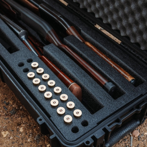 This #2106 hard case comes with pre-cut foam for 3 shotguns, 2+ ammo boxes, and accessories. Shotgun forms are 49.81” length x 1.85” width x 4.50” deep. Square accessory pockets are 4.25” length x 2.81” width x 4.50" deep. Long accessory pocket is 18.35" length x 1.44" width x 4.50" deep. Includes convoluted (egg-crate) foam in the lid.
