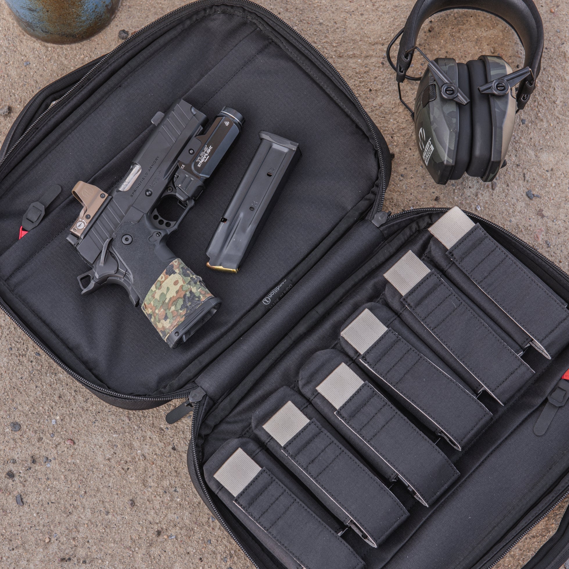 Inside, EVA padding, PP-reinforced panels, and YKK zippers team up with premium finishes for a fit that screams high-end. It easily secures two full-size pistols with optics and lights, plus 6 dedicated mag pockets that swallow up to 7” sticks.